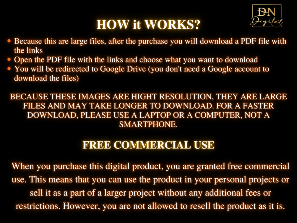 When you purchase this digital product, you are granted free commercial use. This means that you can use the product in your personal projects or sell it as a part of a larger project without any additional fees or restrictions. However, you are not allowed to resell the product as it is.