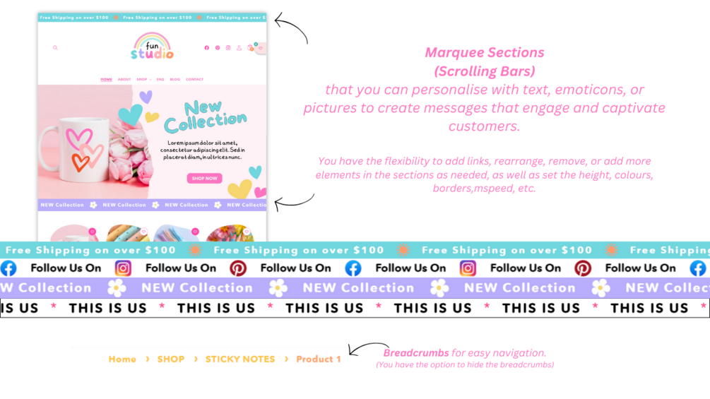 • Marquee Sections (Scrolling Bars) that you can personalise with text, emoticons, or pictures to create messages that engage and captivate customers.